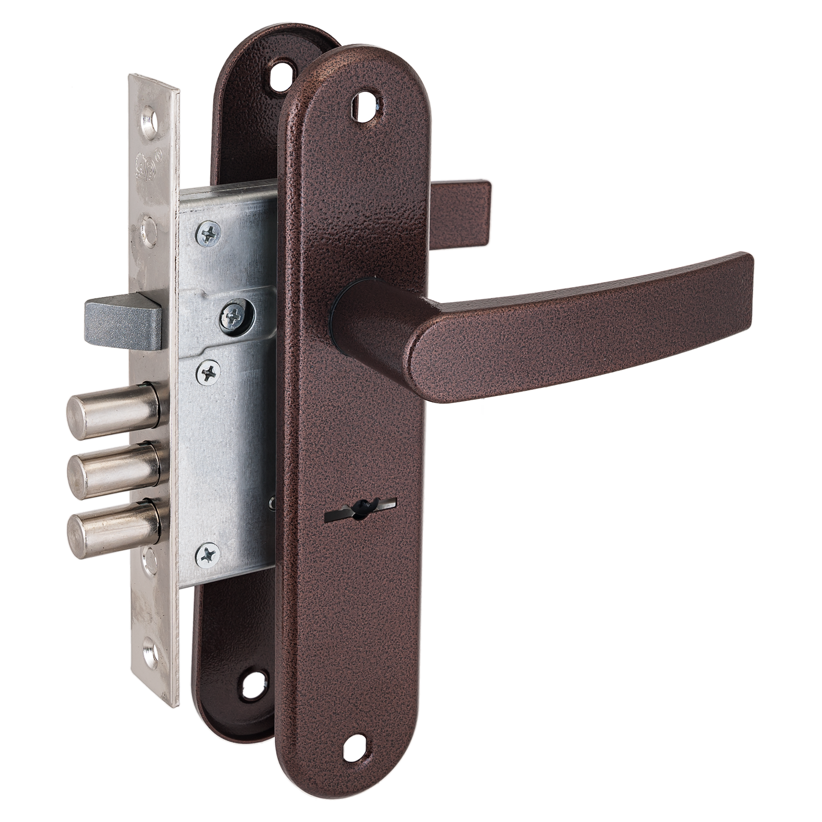 Замок врезной с ручками, 8-и сувальдный. Предназначен для установки в деревянные двери толщиной 40-50мм, правого и левого открывания. Дверь может быть закрыта на защелку и открыта с помощью фалевой ручки при открытом засове замка.