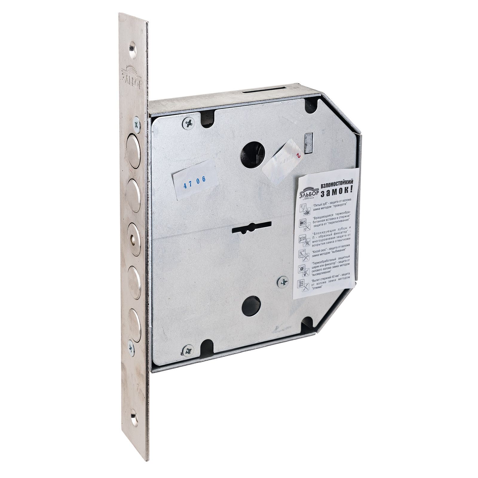 Замок врезной сувальдный для металлических дверей. Засов из пяти цилиндрических ригелей диаметром 18 мм, с максимальным вылетом 40 мм. Удаление ключевого отверстия 66,5 мм. Количество оборотов ключа - 4. Габариты замка - 137,5х146х30 мм. Комплектация - 5 ключей, съемная торцевая планка, комплект накладок. В одном из ригелей расположен закаленный стальной стержень, обеспечивающий надежную защиту от перепиливания. Защита от криминального и силового взлома, высверливания, выдавливания.