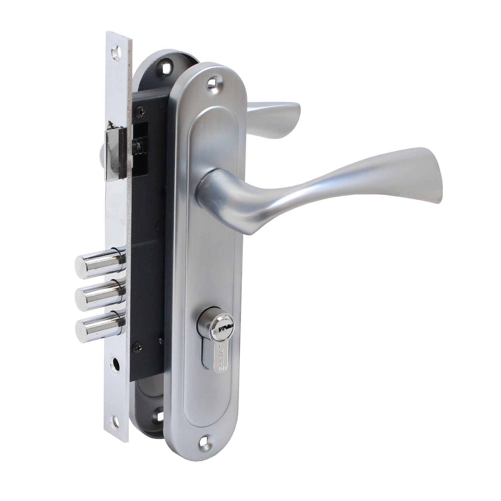 Три круглых стальных ригеля диаметром 12 мм. Универсальная защелка. Стальной корпус покрыт полимерной краской. Межосевое расстояние 70 мм. Удаление ключевого отверстия 45мм. Материал ручек - алюминиевый сплав.