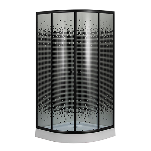 Профиль и дуги чёрного цвета. Стекло тонированное с нанесением пикселей. Толщина стекла 4 миллиметра. Высота поддона 13 см.