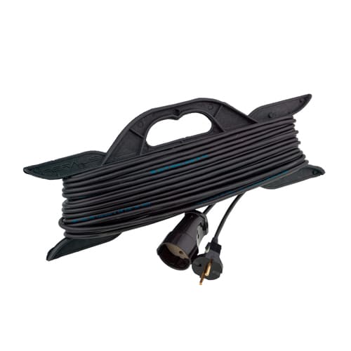 Удлинитель на рогатке- это отличный вариант для работы на высоте или в стесненных условиях, так как, в отличие от удлинителя на катушке, такой занимает гораздо меньше места. Кроме того, его легко переносить по рабочему участку. Конструктивно удлинитель представляет из себя пластиковую рамку с ручкой и намотанным на неё проводом.