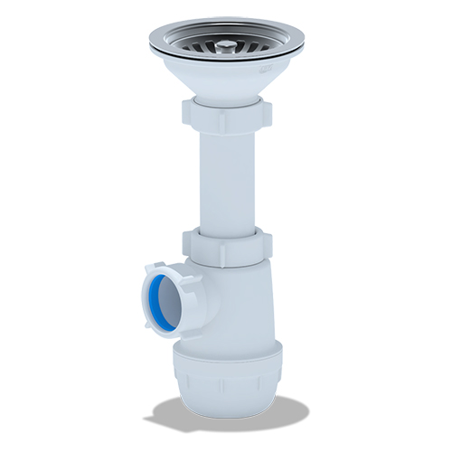 Сифон для кухонных моек с диаметром сливного отверстия 90 мм, бутылочного типа с увеличенным корпусом. С разборным выпуском и нержавеющей решеткой, выход для подключения к канализации 40 мм