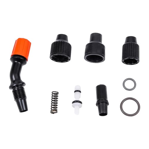 Комплектация: кольцо уплотнительное, пружина клапана, клапан в сборе, кольцо уплотнительное, гайка шланга, уголок в сборе, гайка уголка, гайка трубки, втулка.