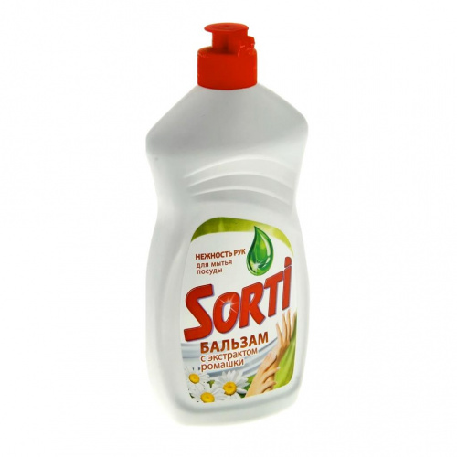 Средство для мытья посуды «Бальзам с Экстрактом Ромашки» Sorti (Сорти), для тех кто хочет эффективно бороться с загрязнениями, но при этом бережно относится к коже рук.
