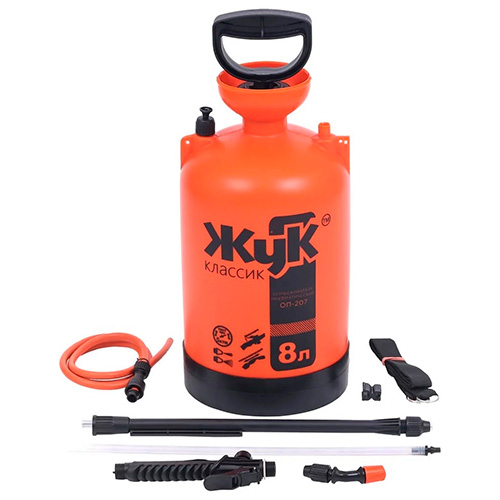 Опрыскиватель ОП-207 Жук 8 л предназначен для полива домашних или садовых растений, оранжерей, внесения жидких удобрений, подкормки. Может применяться для распыления чистящего средства при мытье стен, окон, дезинфицирующего раствора.