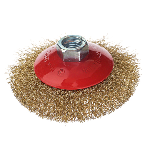Щетка из латунированной волнистой проволоки для УШМ используется для шлифовки металлических или деревянных поверхностей и деталей, очистки от ржавчины, загрязнений и лакокрасочных покрытий, получения заданной шероховатости. Насадка оснащена гайкой М14 для надежной фиксации.