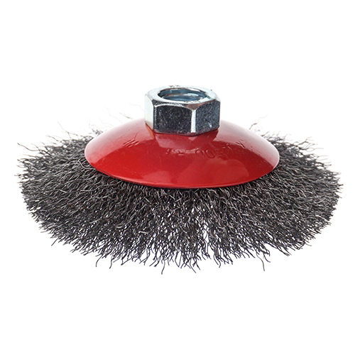Щетки конические диаметра 100 мм с посадкой М14 на УШМ с гофрированным (волнистым) ворсом предназначены для средней тяжести зачистных работ по изделиям из нержавеющих сталей и цветных металлом, используются в основном для работы в труднодоступных местах, стыках, переходах поверхностей.