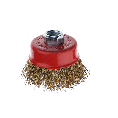 Щетка «чашка» диаметром 65 мм, с щетиной из латунированной витой проволоки, устанавливается на вал УШМ с помощью гайки М14. Предназначена для снятия тонкого слоя краски или лака, удаления ржавчины и загрязнений с древесины, металла, пластика и других твердых поверхностей.