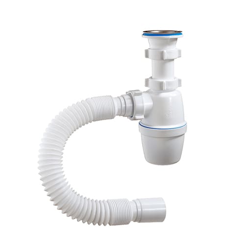 Сифон с большим корпусом и отстойником, выпуском, нержавеющей чашкой д.70мм и гибкой трубой 40-40 для мойки.