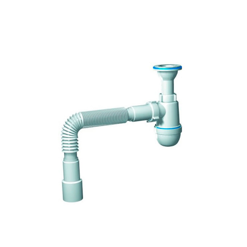 Сифон для кухонной мойки с диаметром сливного отверстия 50 мм, бутылочного типа. С литым выпуском и нержавеющей решеткой, для подключения к канализации комплектуется гибкой трубой 40*40/50 мм