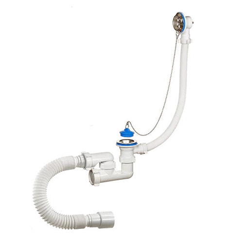 Сифон 1 1/2"х40, с переливом и нержавеющими чашками, для ванн и глубоких душевых поддонов. Конструкция сифона позволяет прочищать сифон, не демонтируя. В комплекте латунная цепочка с пробкой. Отвод в канализацию гибкая труба 40 – 40/50