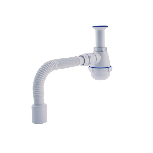 Сифон для кухонных моек с диаметром сливного отверстия 50 мм, бутылочного типа с увеличенным корпусом. С литым выпуском и нержавеющей решеткой. Для подключения к канализации комплектуется гибкой трубой 40*50 мм